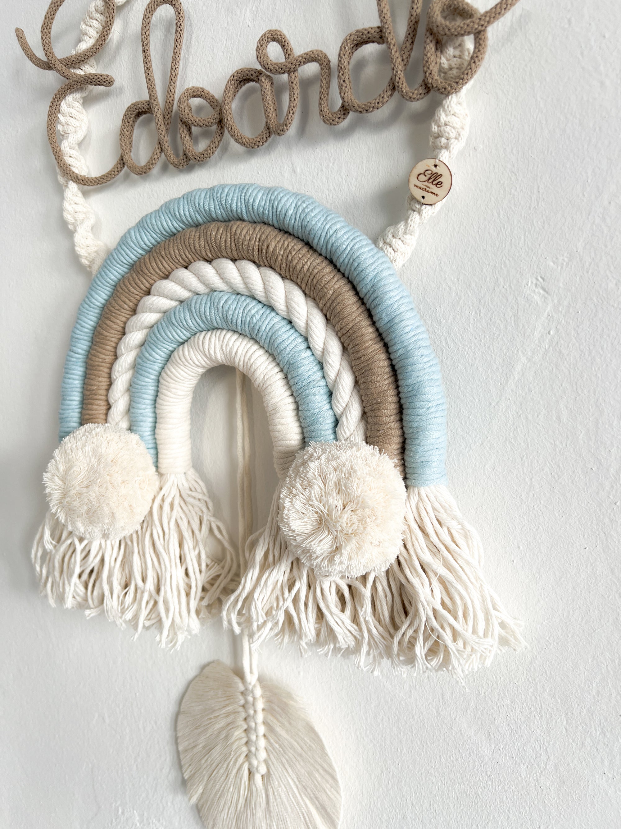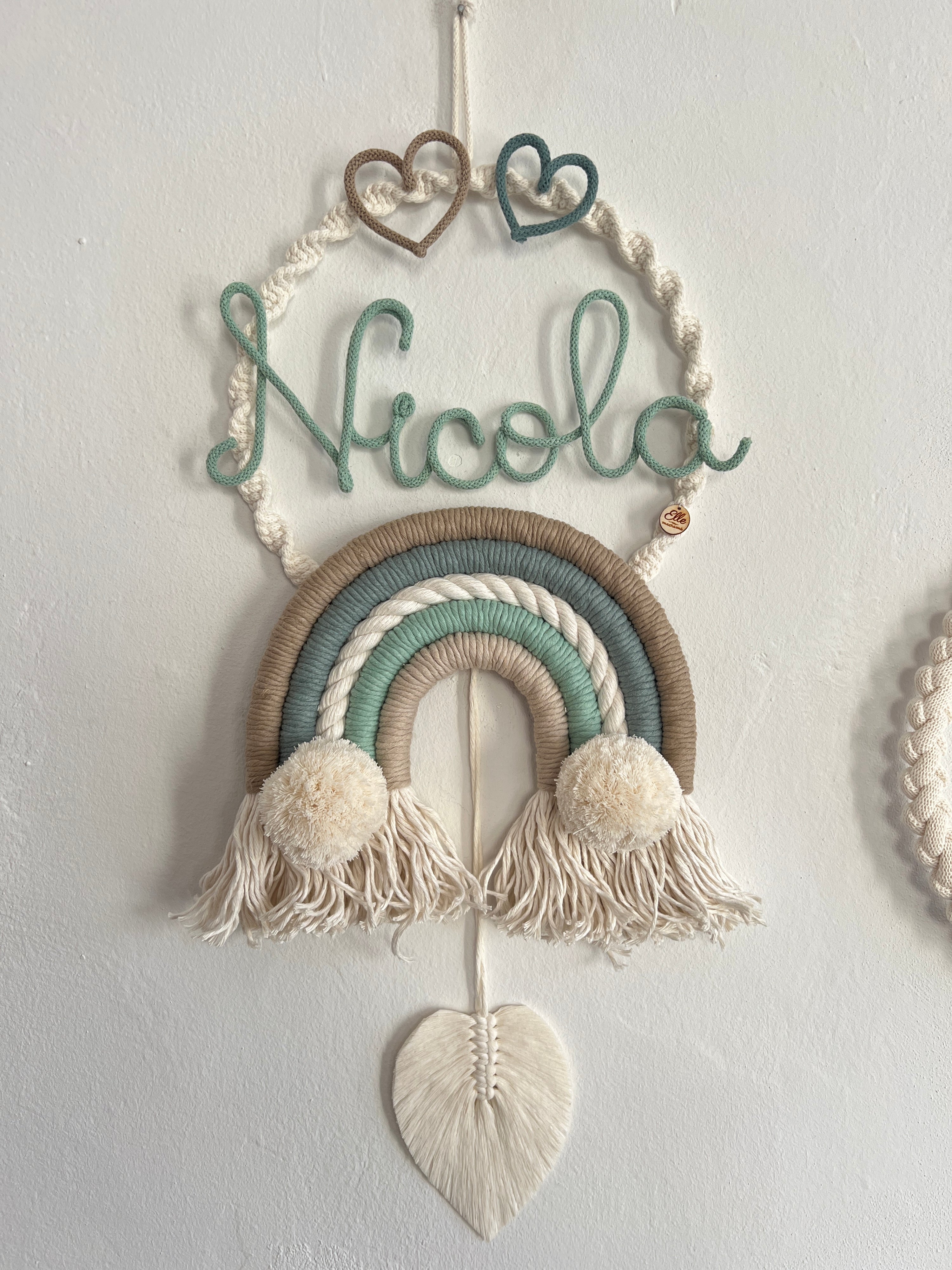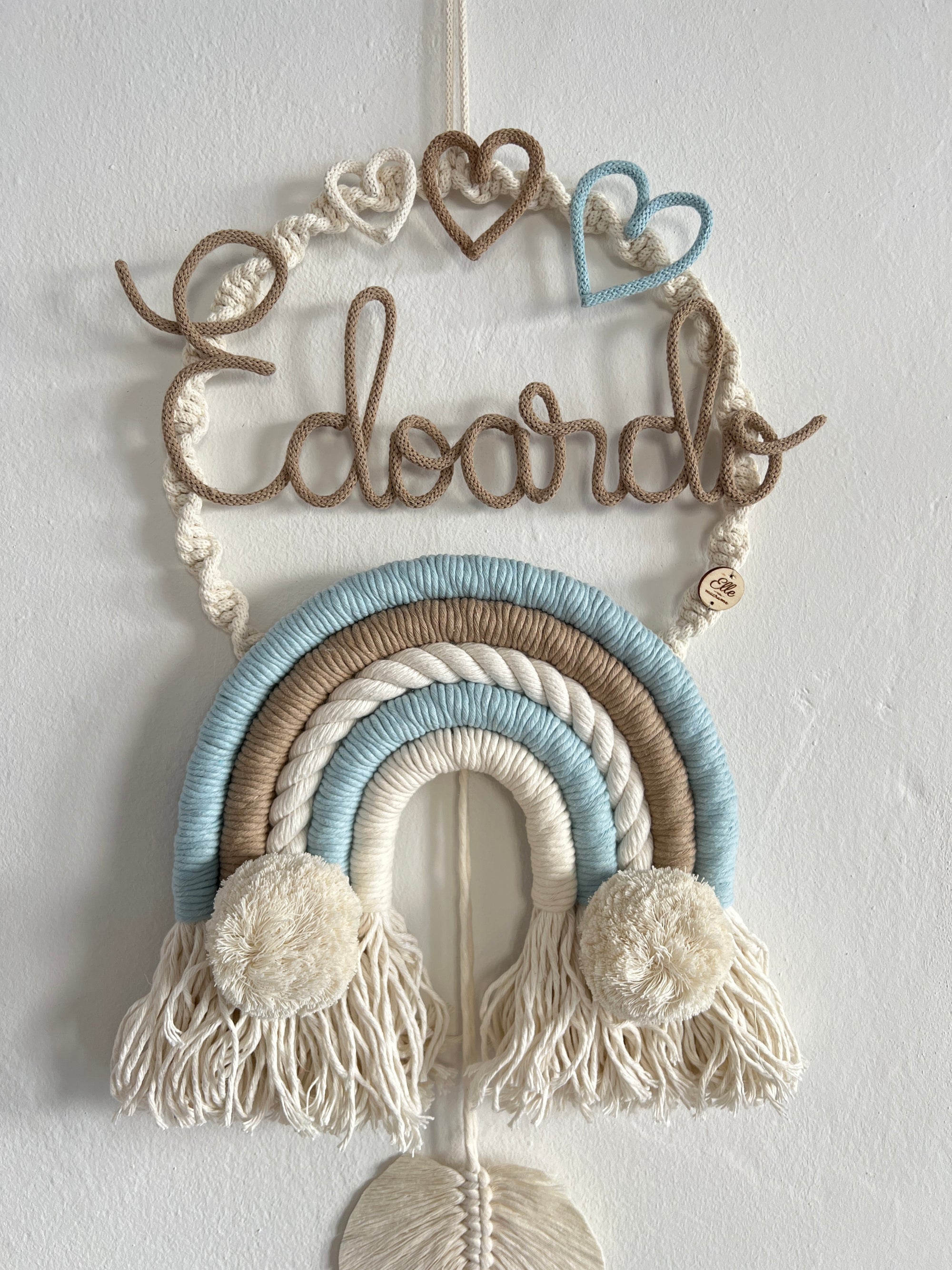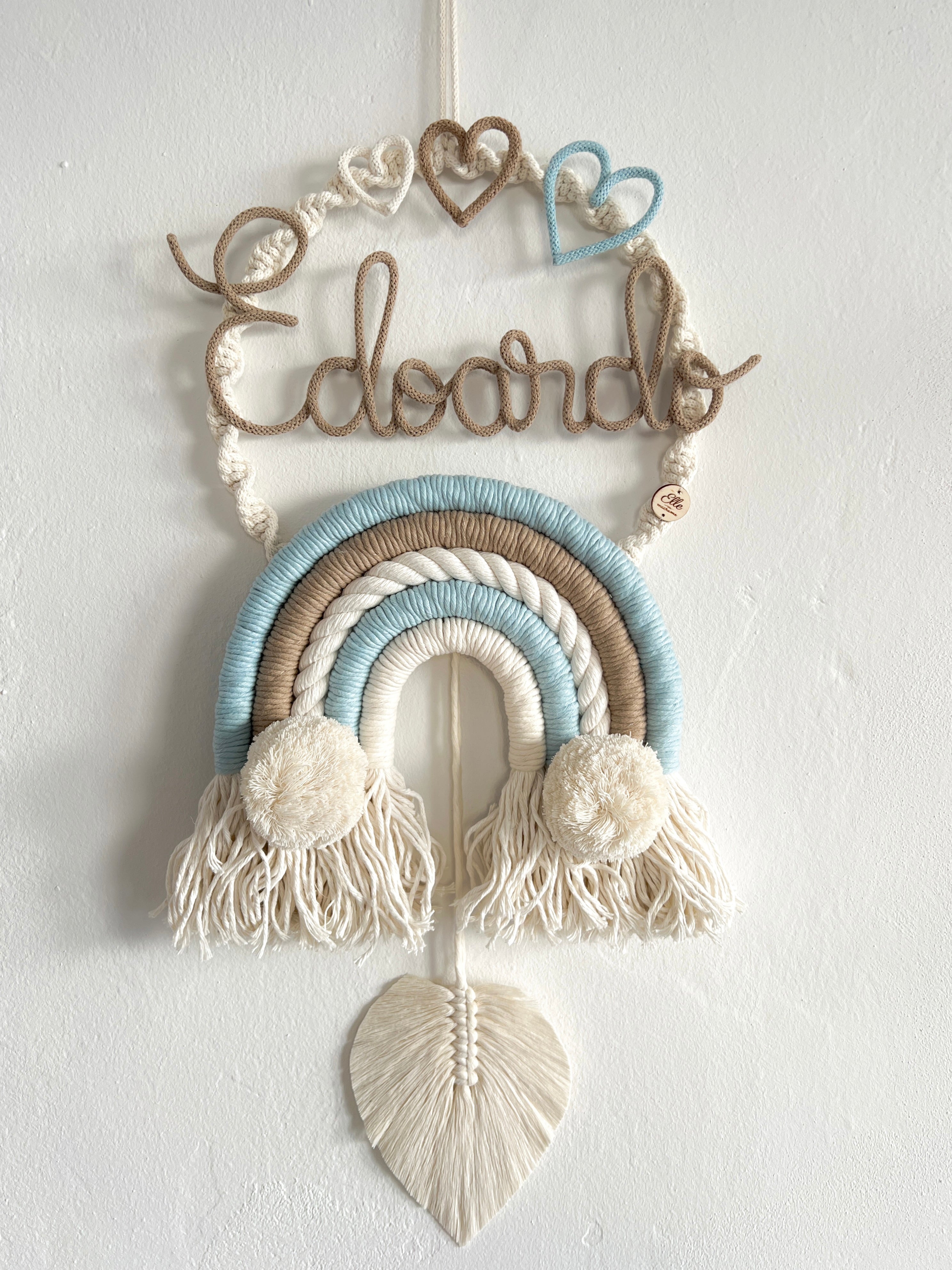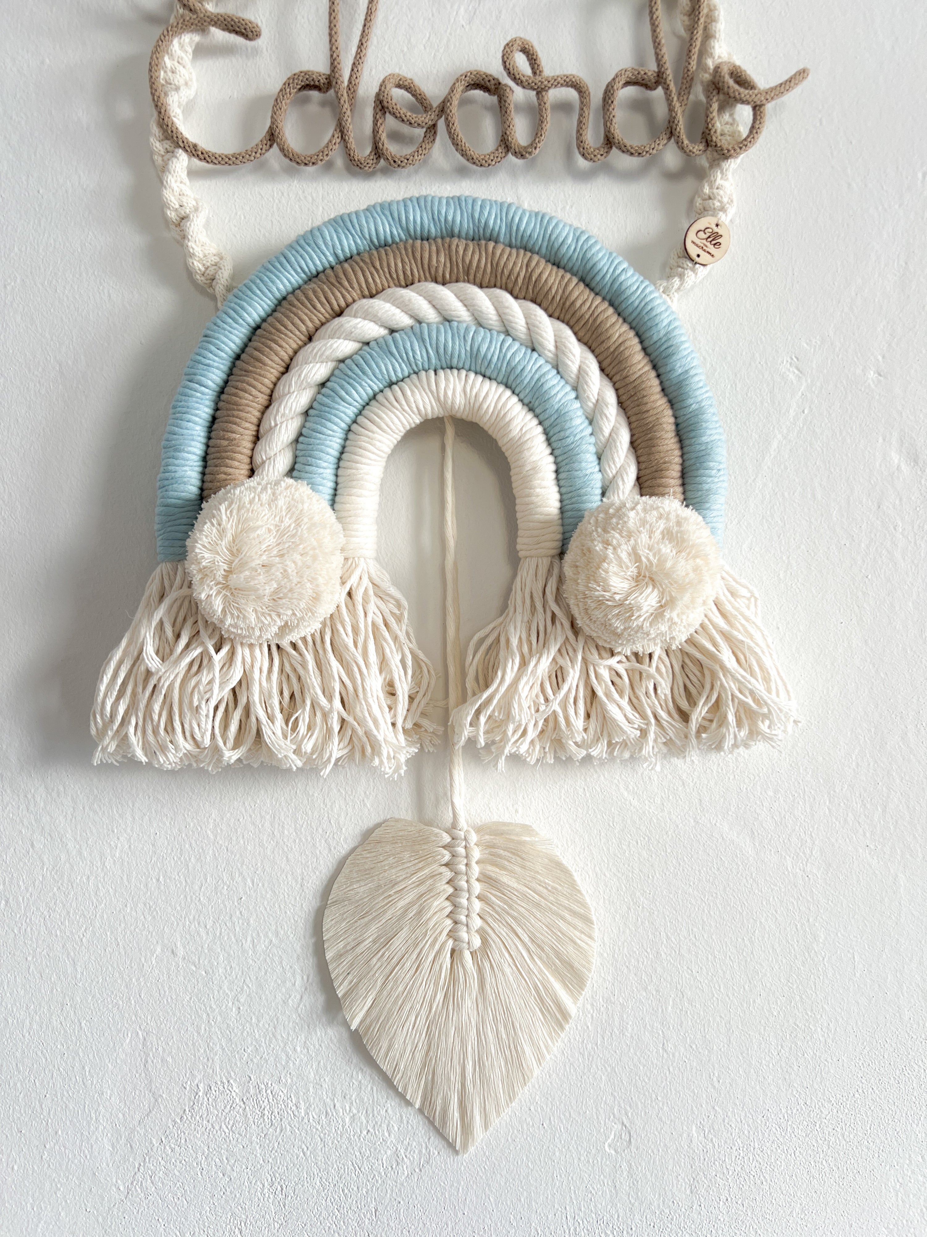 Un fiocco nascita scenografico e originale, caratterizzato da un grande arcobaleno a cinque archi che crea un effetto avvolgente e dinamico. Una creazione ricca di personalità, impreziosita da dettagli morbidi e voluminosi che donano movimento e profondità, perfetta per annunciare una nascita o decorare la cameretta con un tocco unico.
