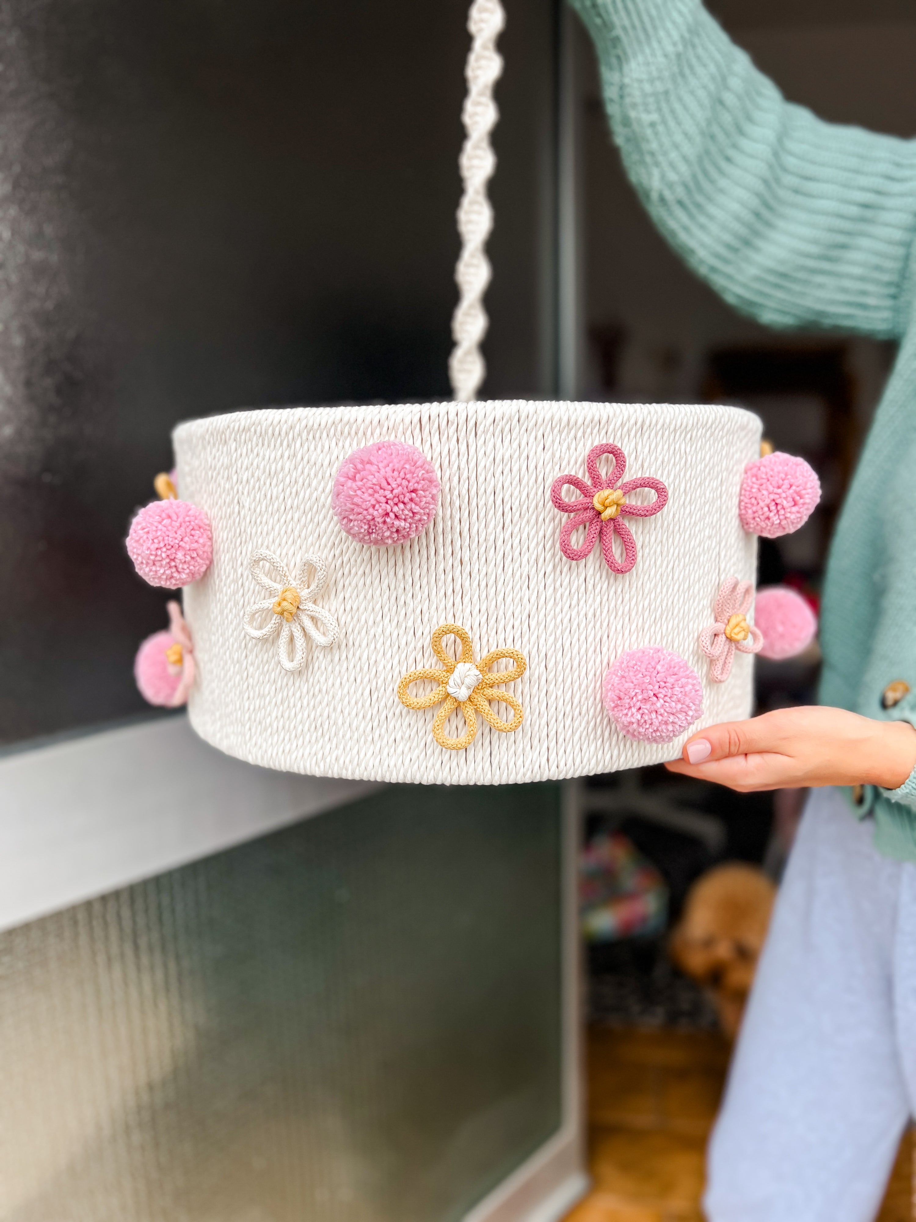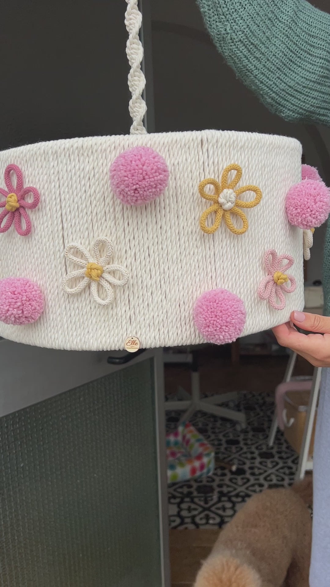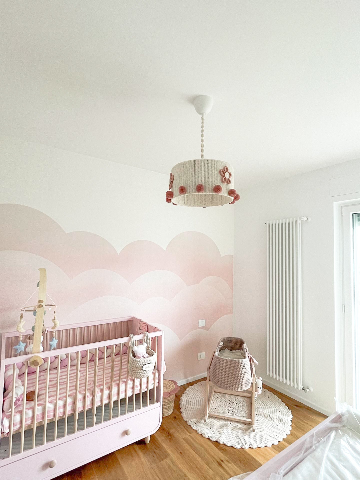 Un lampadario decorativo delicato e armonioso, caratterizzato da pompon e fiorellini, che donano movimento e leggerezza all’insieme. Un complemento d’arredo ideale per illuminare con dolcezza la cameretta dei più piccoli.